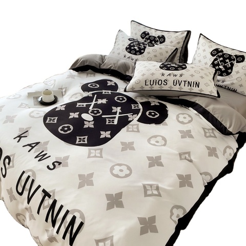 솔질된 면 4-in-1 침구 세트 블랙 베어 킹 사이즈 이불 커버 침대 시트 침구 세트